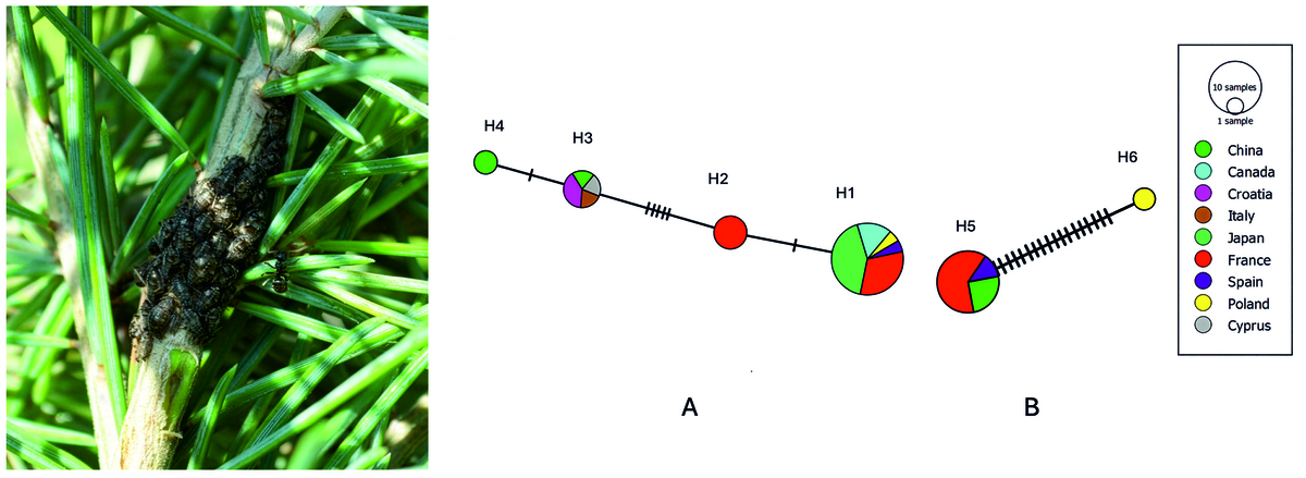 Aphids are a strict group of insects that are particularly stimulated by current climate changes. Recent modifications in their life cycles, development, migration dates and geographical ranges are attributed to changes of local climates. Cinara curvipes, a species trophically related mainly to Abies spp., has been observed in Poland since 2015, while Cinara cedri, feeding on Cedrus sp., has been observed since 2022. Their presence is always associated with mass occurrence on host plants. The aim of this study was molecular identification of the species C. cedri and C. curvipes, collected in Poland. Potential pathways of introduction and spread of these species across Europe and the world was discussed. Based on the analysis of two genetic markers (COI and EF1-α), haplotype networks illustrating the relationships between populations from different parts of Europe and the world were presented. A contrasting pattern of low intraspecific variation in C. curvipes, but high in C. cedri was demonstrated, which may be associated with the modes of reproduction, mechanisms of dispersal of these two species, as well as introgressive hybridization between C. cedri and aphids belonging to Cinara (Cupressobium). Genetic relationships between mitochondrial haplotypes have shown that these species have reached Poland from western and southern Europe. These species have spread from their natural range mainly through imported plant material. Human activity and climate warming have enabled them to successfully settle.